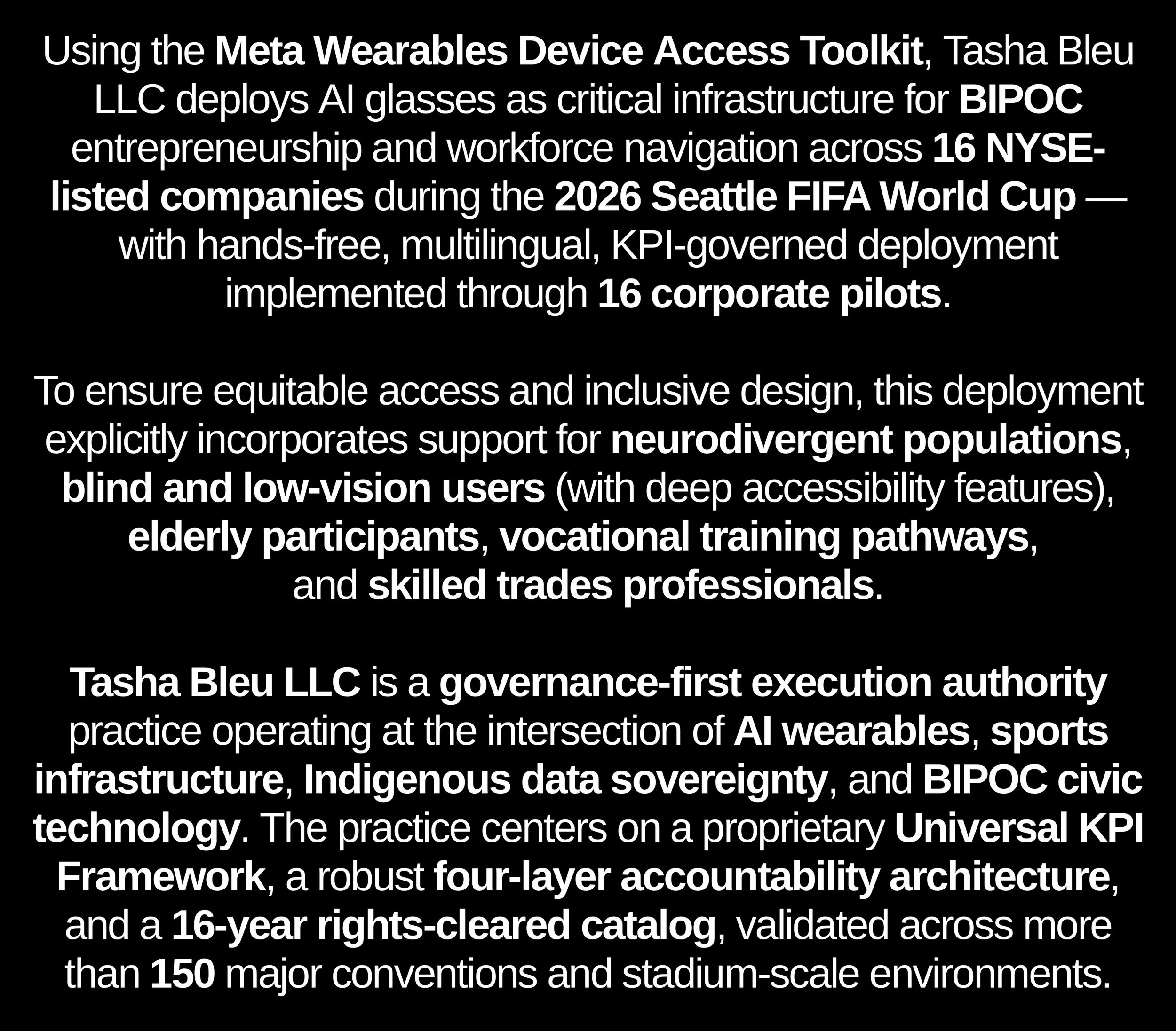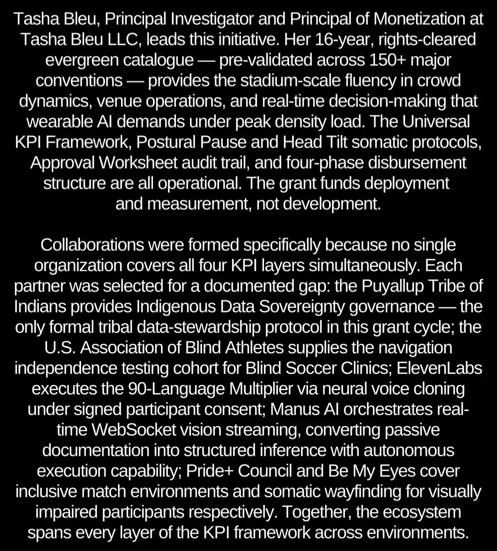 This proprietary prototyping and piloting sequence, featuring AI-powered smart glasses for the blind, low-vision, and deaf, is cataloged as a high-impact inclusivity anchor within Tasha Bleu®’s fully rights-managed portfolio. As a technically validated and exclusively owned asset, it establishes durable provenance at the intersection of assistive technology, global sport, and human-centric visibility environments. Within the catalog, this pilot functions as a structural utility driver aligned with FIFA’s accessibility mandates and the 2026–2034 World Cup Corridor, routing innovation across successive tournament cycles, multi-sensory fan engagement windows, and global stadium infrastructures. Its sustained implementation reinforces technological valuation, governance clarity, and cross-cycle scalability without dependency on hardware.