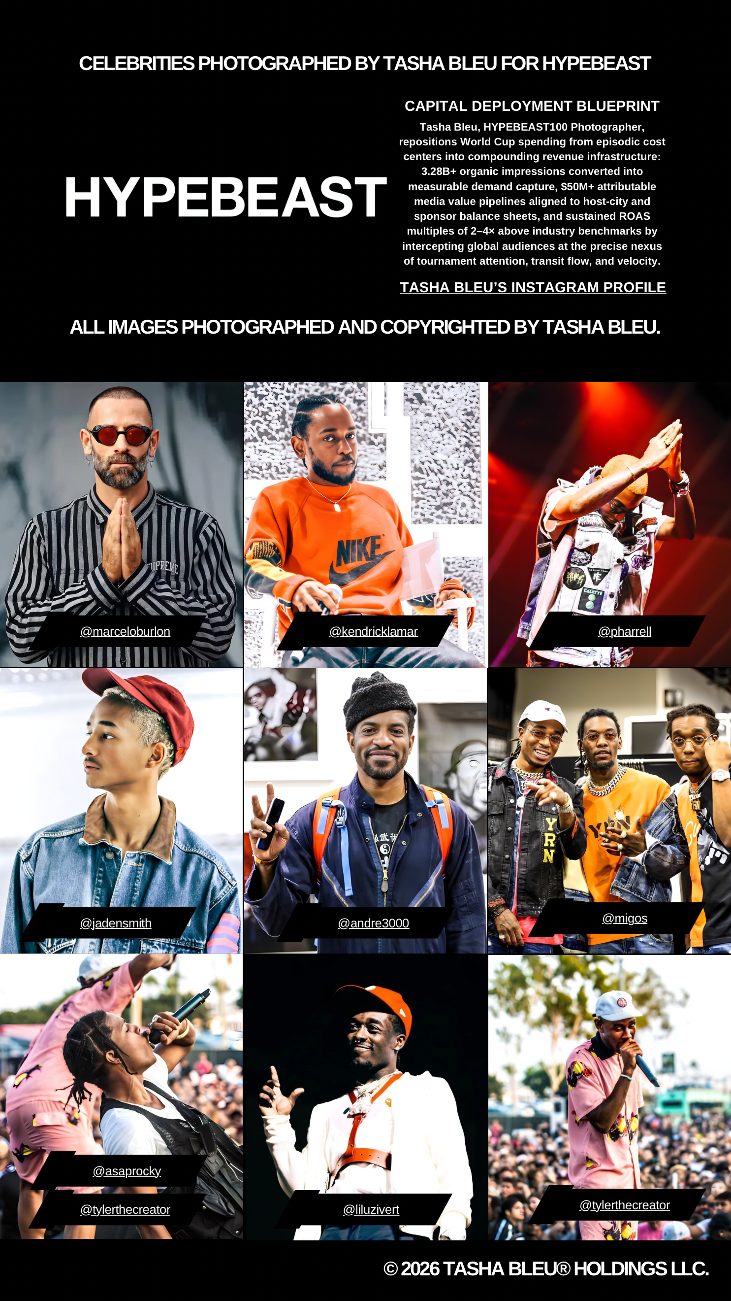 Tasha Bleu operates a modular behind-the-scenes production system optimized for World Cup environments, deploying only essential personnel—BTS capture, drone, digital tech, and AV coordination—to maximize output per dollar. Content is structured for immediate multi-platform use and long-tail monetization without incremental overhead, ensuring high asset yield relative to spend.