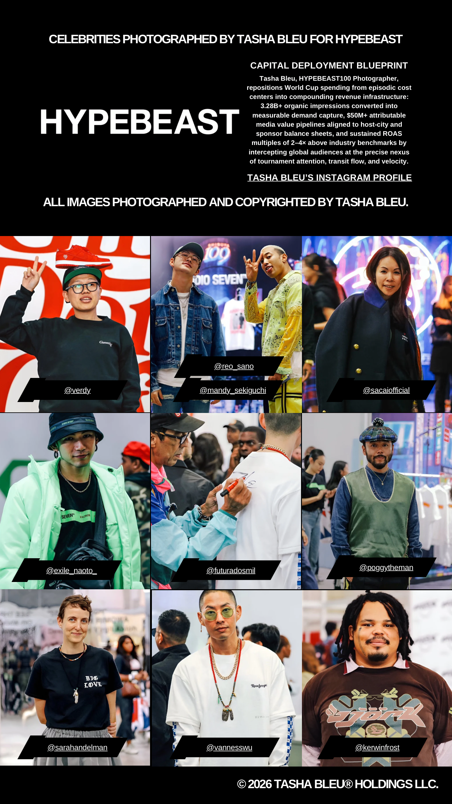 Documented through the lens of Tasha Bleu®, this HYPEBEAST100 portrait of Grammy-winning André 3000 is cataloged as a rights-cleared asset within her Vault. Positioned alongside Kobe Bryant and Virgil Abloh, the work forms a deliberately constructed continuity set of cross-disciplinary reference anchors spanning music, sport, and fashion. Within the catalog, this triadic placement functions as a comparative framework that reinforces provenance density, scarcity logic, and long-horizon relevance. Beyond portraiture, the asset operates as part of a structured visual anthology—designed to preserve cultural signal integrity, sustain generational recognition, and support durable valuation across evolving cycles.