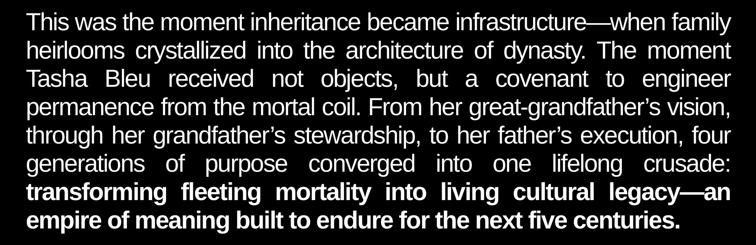 - Tasha Bleu’s heirs inherit her Father-Focused Storytelling Architecture®, codified as dynastic law