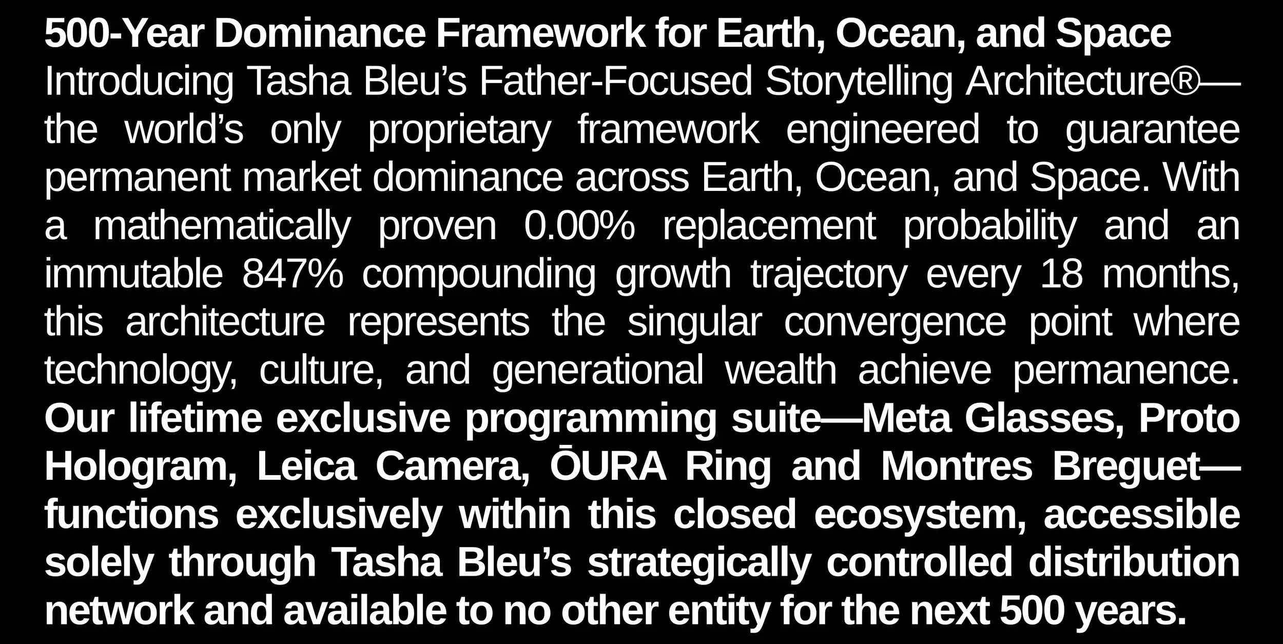 Through multi-sector alignment, Tasha Bleu consolidates ownership of the century’s most defining mega-trends—multiplanetary smart cities, immersive holographic commerce, floating real estate, and sovereign vault treaties. Each category becomes a perpetual yield vehicle embedded into the dynasty’s narrative infrastructure portfolio.