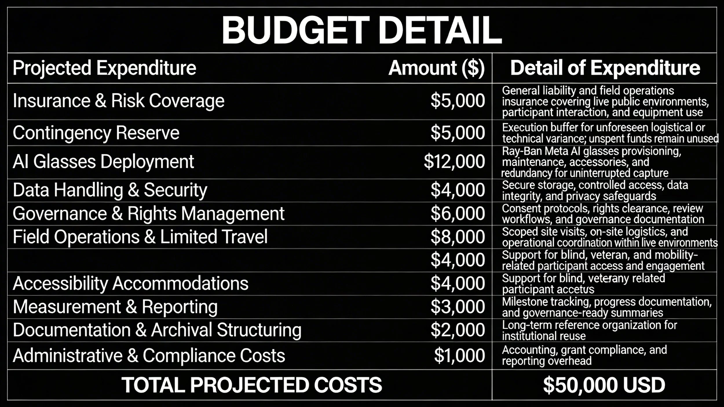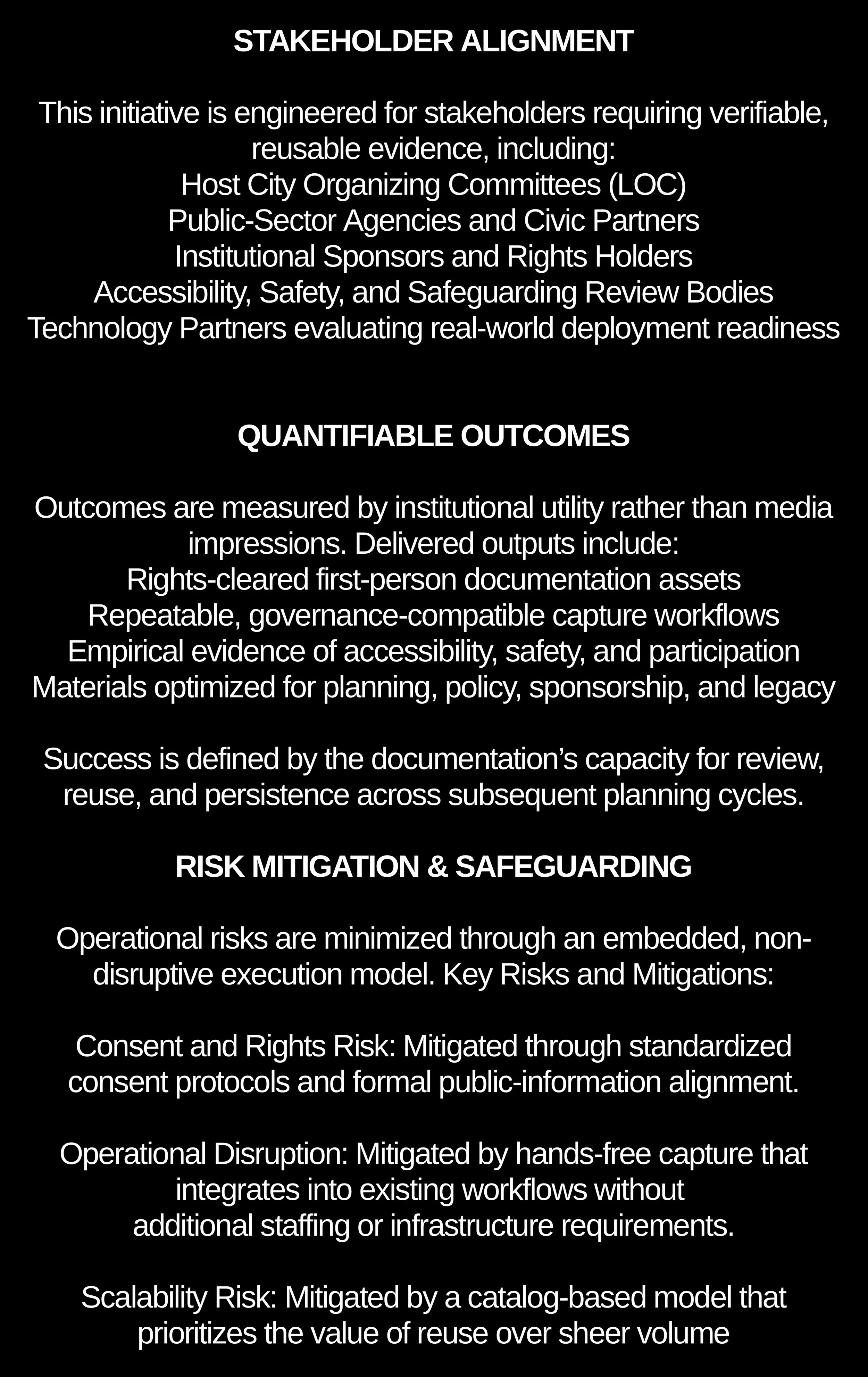 Viewed through the lens of governance-ready AI wearables, this social impact initiative captures and records first-person participation environments for Seattle FWC26—specifically across Blind Soccer, Pride, Juneteenth, and Indigenous Games. By converting lived experience into durable, high-fidelity reference material, the project reinforces institutional learning, inclusive governance, and participant safety within the Meta ecosystem.