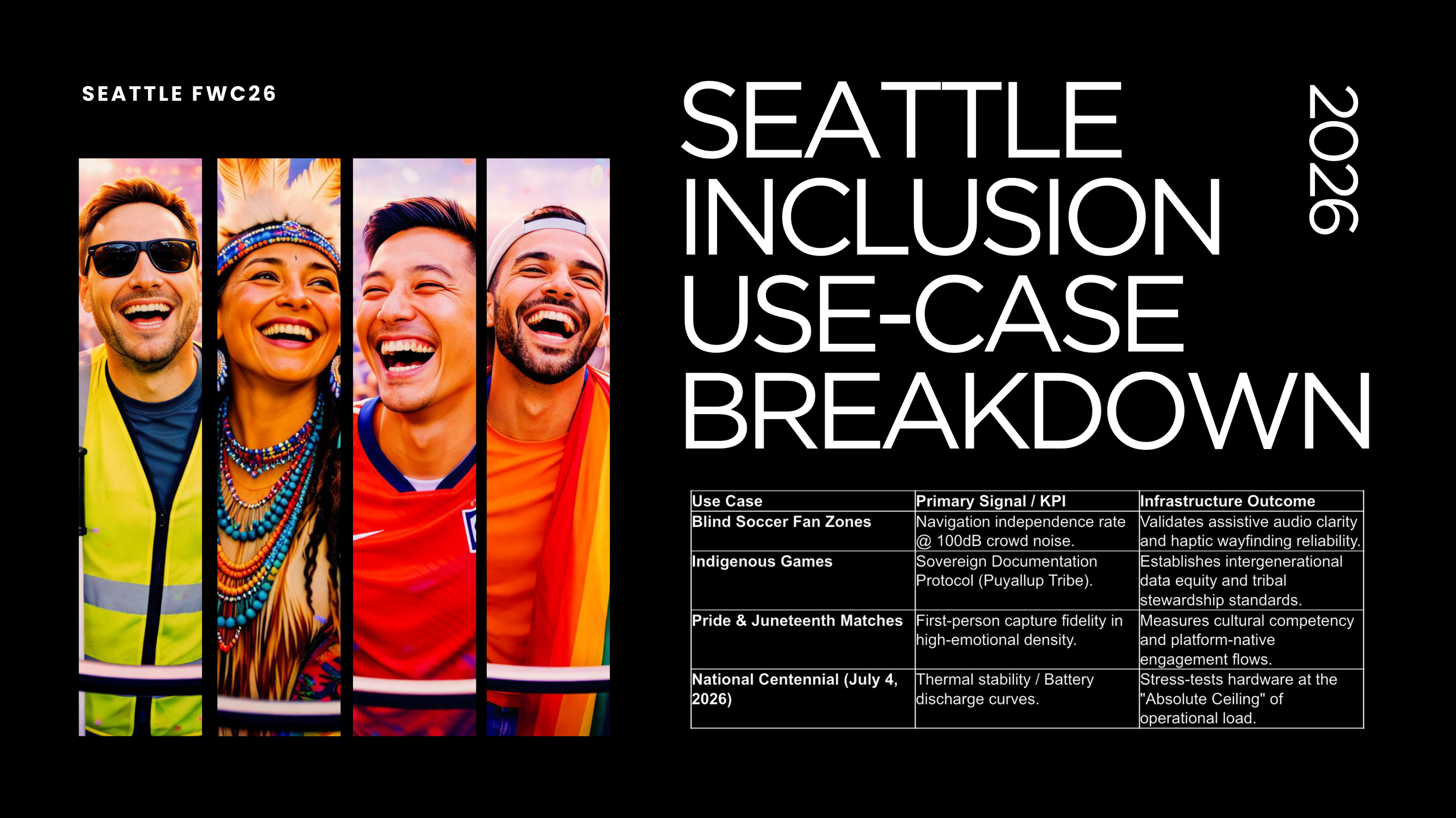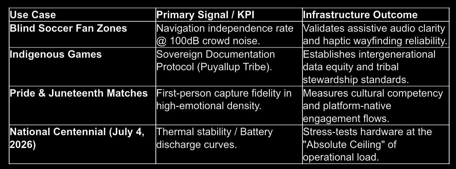 Viewed through the lens of governance-ready AI wearables, this social impact initiative captures and records first-person participation environments for Seattle FWC26—specifically across Blind Soccer, Pride, Juneteenth, and Indigenous Games. By converting lived experience into durable, high-fidelity reference material, the project reinforces institutional learning, inclusive governance, and participant safety within the Meta FoA